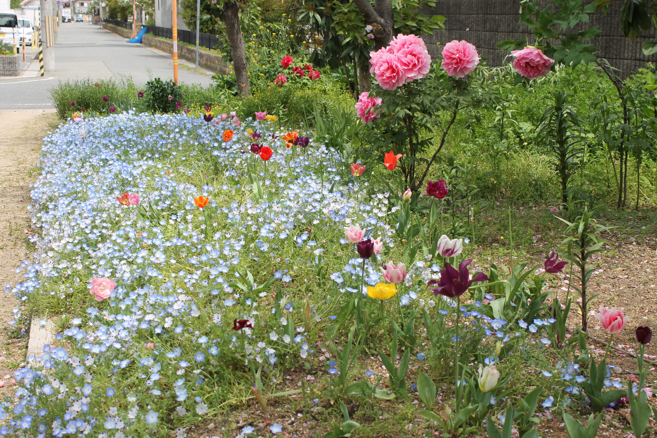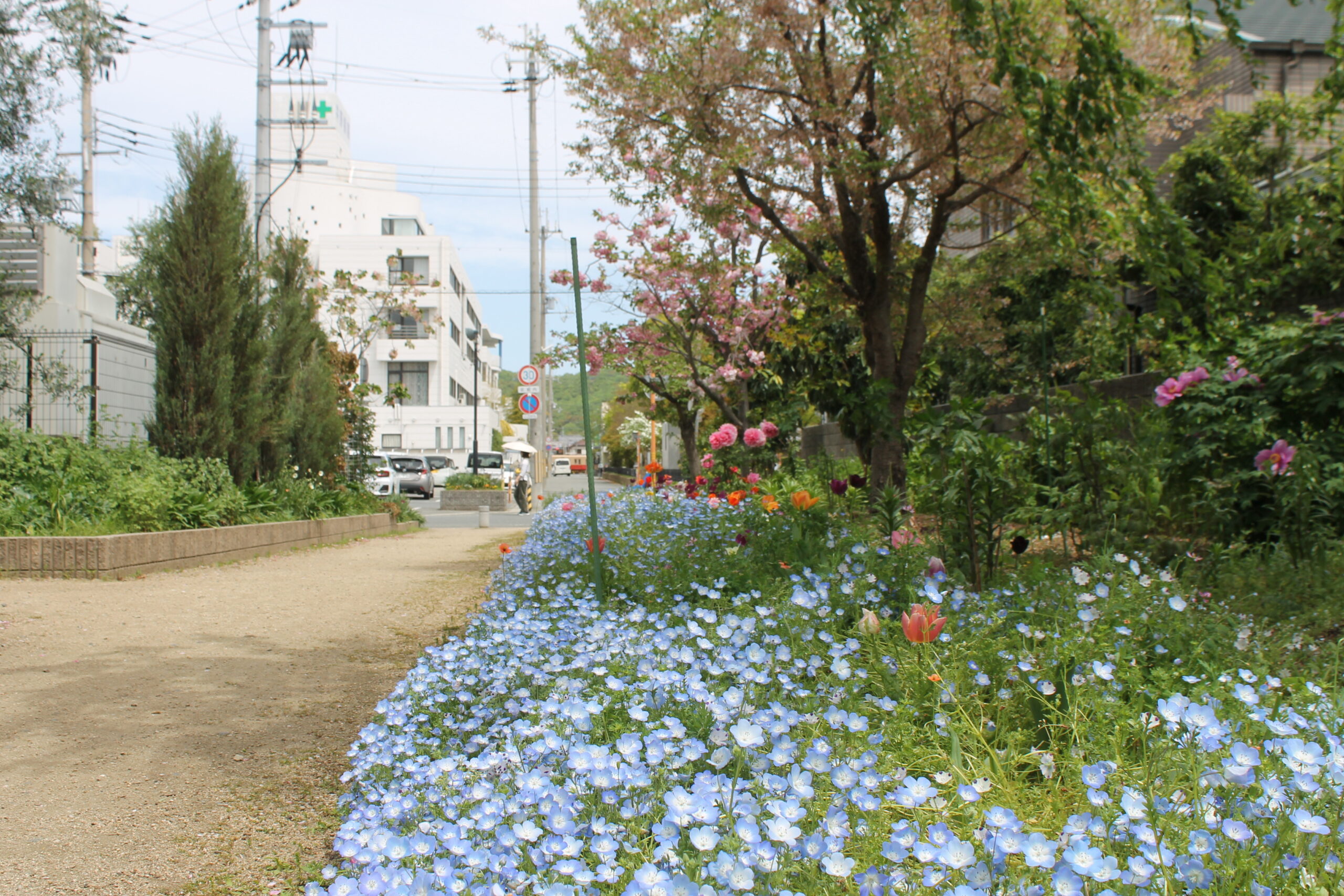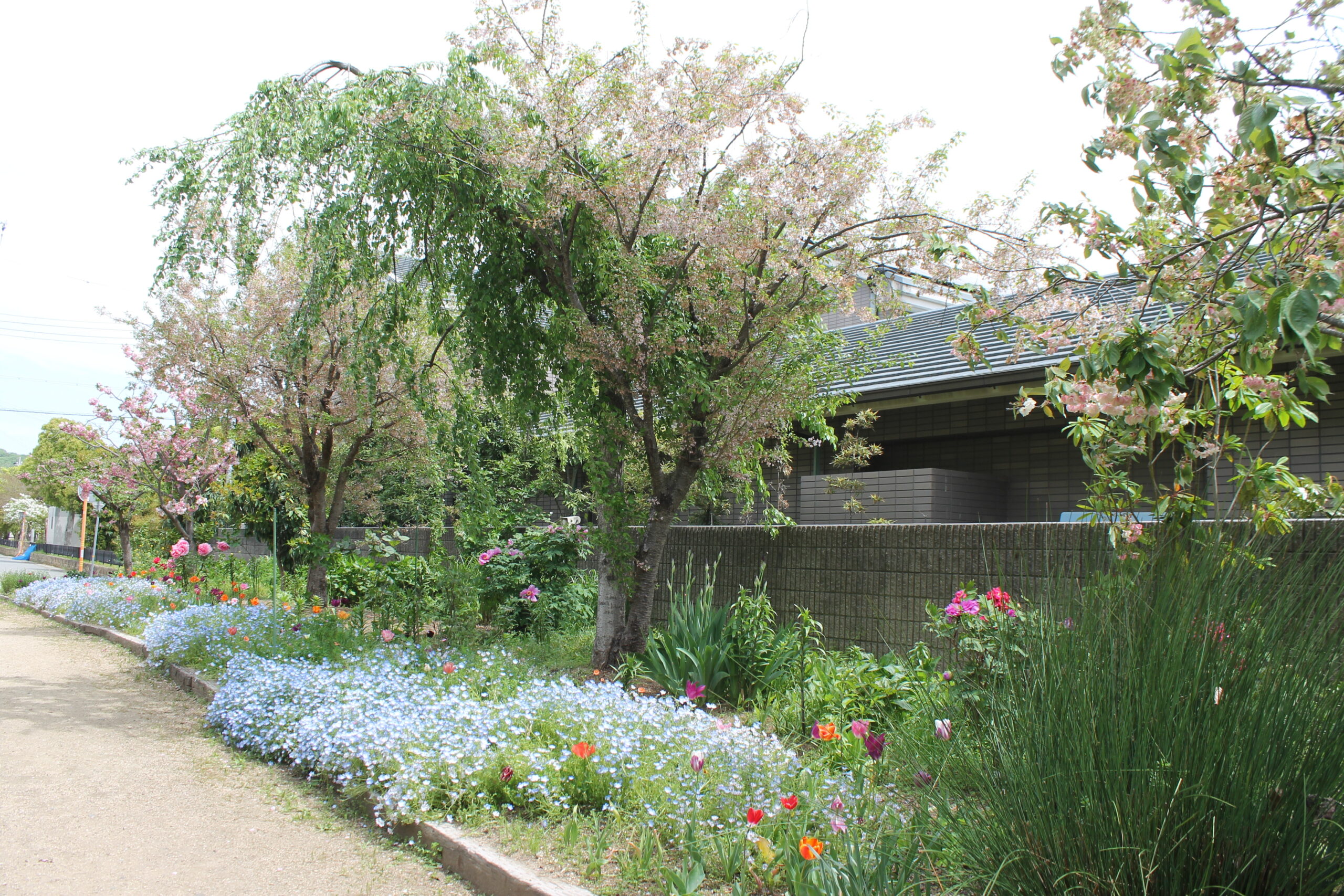 庭や花壇だけでなく、井野病院の出入口や駐車場にも花や緑が豊かに広がっています。